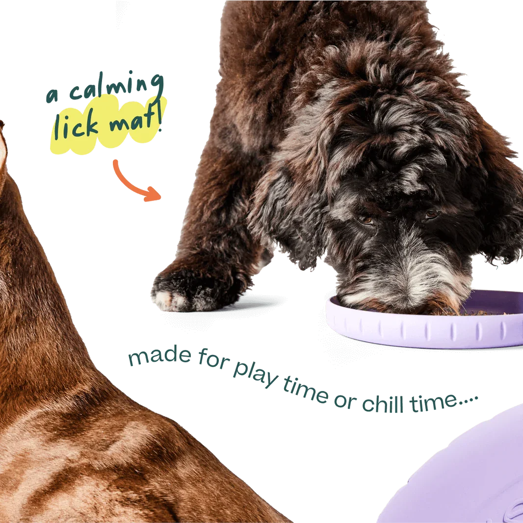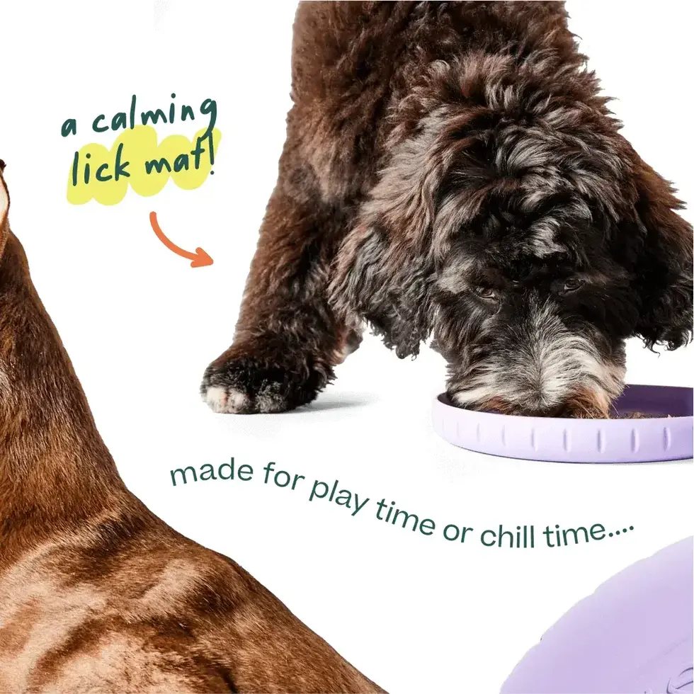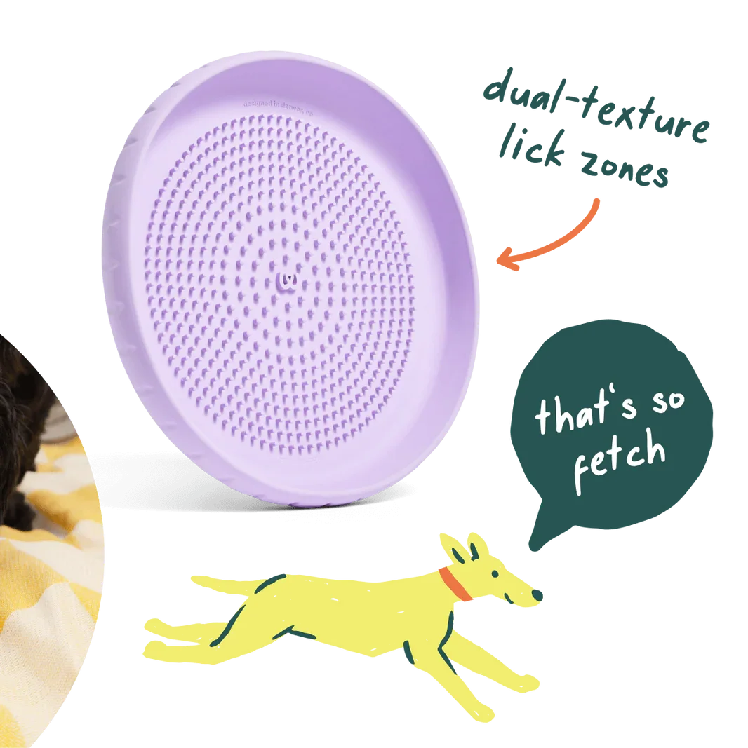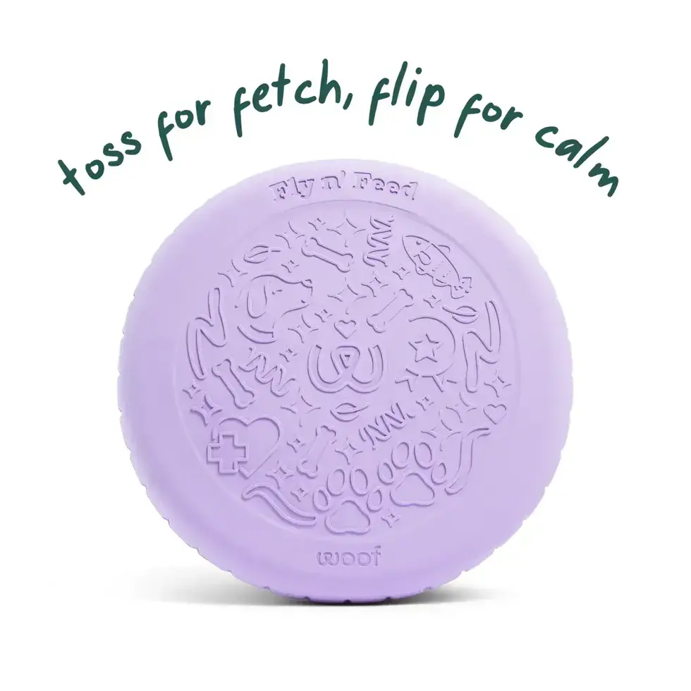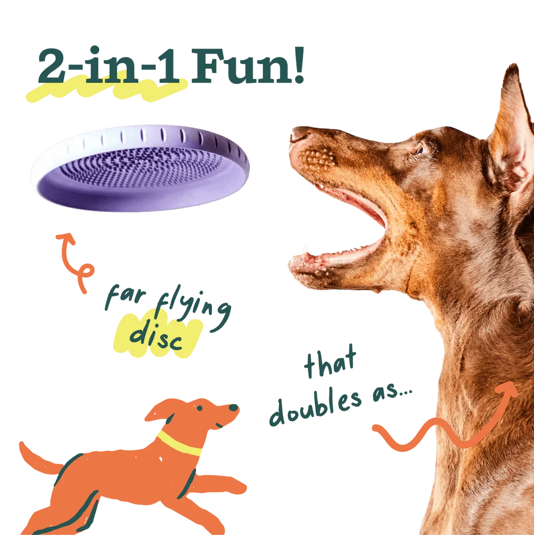 Fly n’ Feed is the flying disc with a secret superpower—it flips into a calming lick mat. Lightweight yet durable, toss for high-energy fetch, then flip to reveal dual-texture lick zones that help pups unwind after play. Rolls up for travel, pops flat for storage, and even doubles as a water dish. Made from tooth-friendly, scuff-resistant rubber and dishwasher safe.